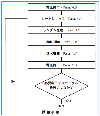 テスト手順には、電圧降下、ヒートショック、ランダム振動、温度/湿度、塩霧テスト、および2回目の電圧降下テストが含まれます。